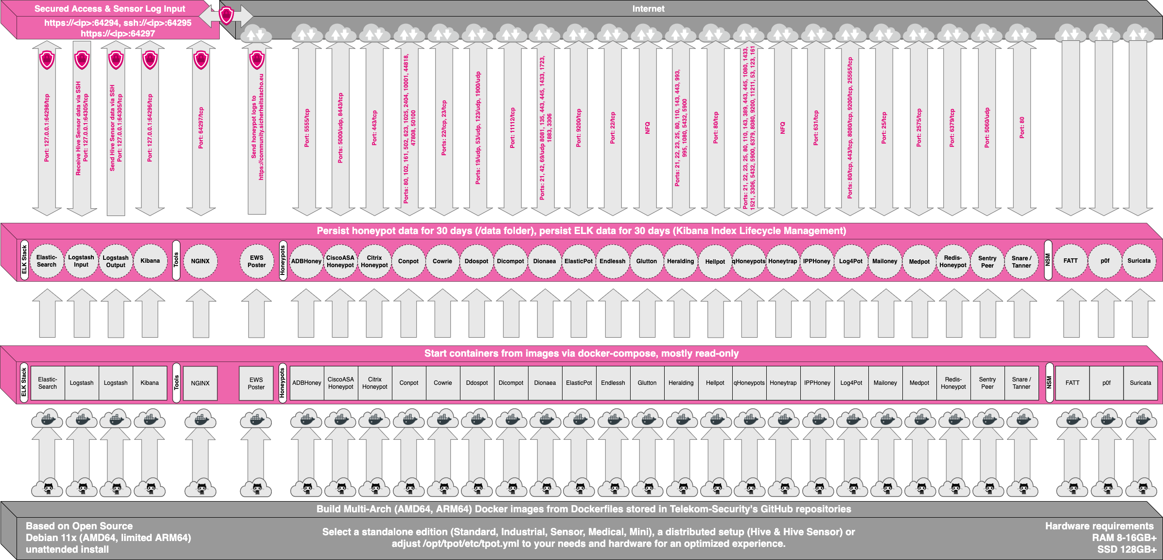 Below is an image of this amazing platforms software architecture to get a sense of the scale and depth deploying T-Pot can provide.
